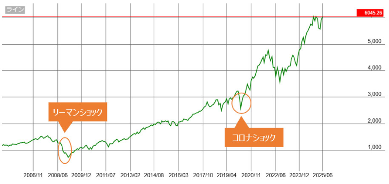 S&P500の過去の推移を振り返ると、短期的な上下動を繰り返しながらも、長期的に見ると右肩上がりの成長を遂げてきたことがわかります。例えば、過去20年間で見ると、リーマンショック(2008年)、コロナショック(2020年)といった経済危機や市場の調整局面を経験しましたが、その都度回復し、高値を更新してきました。