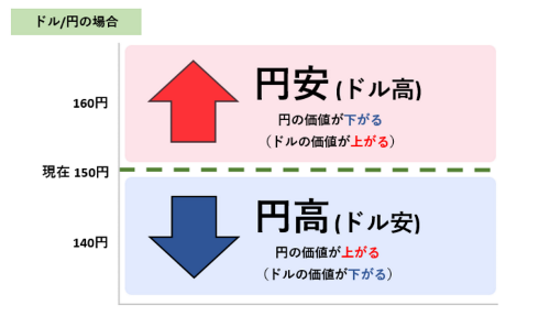 初心者の方は、円の数値が低くなれば円高、高くなれば円安と覚えるのがわかりやすいでしょう。例えば「1ドル=150円」から「1ドル=140円」に変化した場合は円高ドル安、「1ドル=150円」から「1ドル=160円」に変化した場合は円安ドル高です。