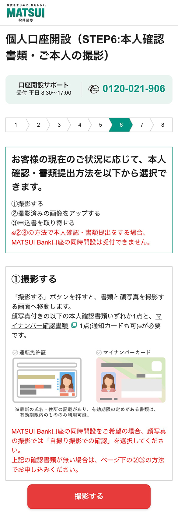 口座開設画面STEP6の「本人確認・書類提出方法」の項目で、「撮影する」をご選択いただき、画面に沿って本人確認をお願いします。