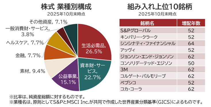 米国配当王ポートフォリオの業種構成はS&P500と大きく異なり、S&P500において高い比率を占める情報技術セクターが組み入れられていません。