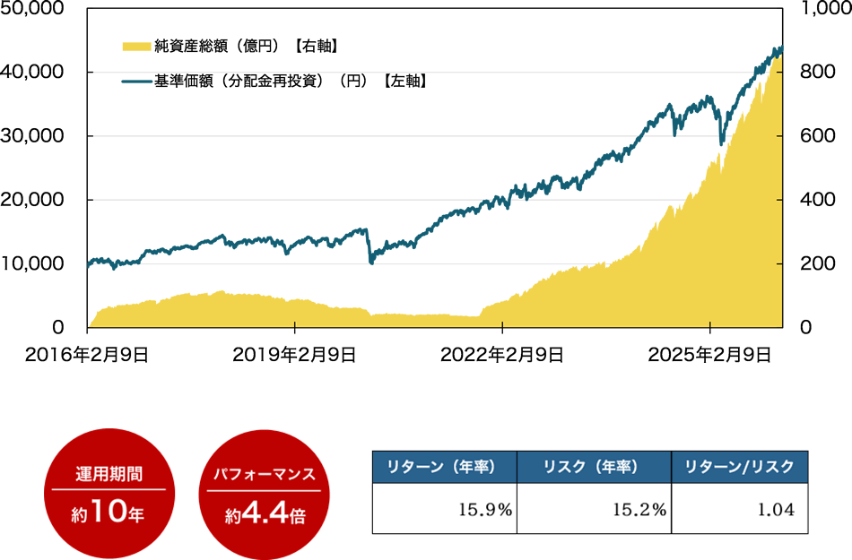 上記は、(3ヵ月決算型)の設定来分配金再投資基準価額をもとに作成しています。上記は、2026年2月27日時点のデータを使用しています。基準価額(分配金再投資)は、運用管理費用(信託報酬)控除後の値です。上記は、過去の実績・状況または作成時点での見通し・分析であり、将来の市場環境の変動や運用状況・成果を示唆・保証するものではありません。また、税金・手数料等を考慮していません。運用実績におけるリターンは月次騰落率の平均を年率換算(月次騰落率の平均×12)したものであり、リスクは月次騰落率の標準偏差を年率換算したものです。リターンとリスクは2026年2月末までの月次データを使用しています。上記は、過去の実績・状況または作成時点での見通し・分析であり、将来の市場環境の変動や運用状況・成果を示唆・保証するものではありません。また、税金・手数料等を考慮していません。市況動向および資金動向等により、上記のような運用が行えない場合があります。
