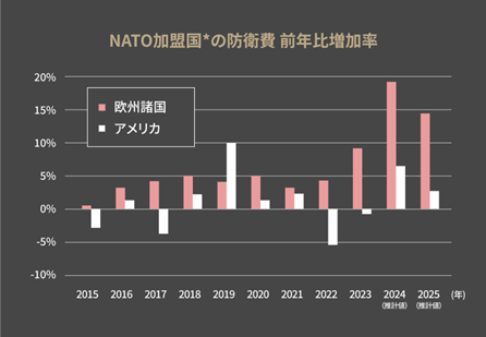 欧州では、ウクライナ情勢など地政学的リスクの高まりに加え、アメリカの「自国第一主義」による欧州への関与低下を背景に、欧州独自の防衛力強化が重要課題とされています。そのため、今後も防衛費の増加が検討されており、関連企業への好影響が期待されます。