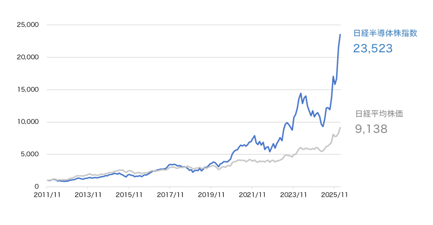 日経半導体株指数は、国内の主要半導体関連30銘柄で構成された株式指数です。パフォーマンスを見ると、2011年11月末からの約14年間で23.5倍のリターンとなりました。