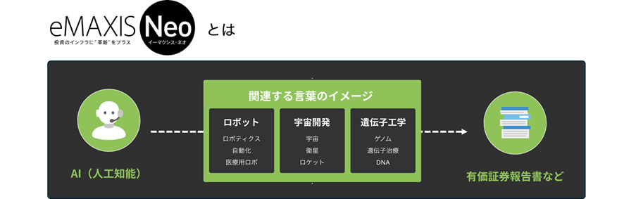 「eMAXIS Neoシリーズ」は、米国上場企業へ投資するインデックスファンドです。 AIの先駆者「Kenshoテクノロジーズ」の技術を活用した指数への連動を目指します。Kenshoテクノロジーズの指数は、AI(人工知能)が数百万ページ以上の企業の開示資料等を自動で読み込み、テーマに関連するコトバの有無を基本に銘柄を自動で選び出します。AIだから、銘柄の取りこぼしが少なく、テーマの恩恵を十分に享受することが期待されます。