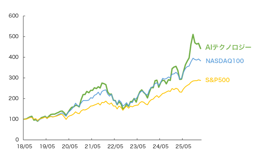 S&P500(配当込み、米ドルベース)、NASDAQ100(配当込み、米ドルベース)、AIテクノロジーはS&P Kensho Artificial Intelligence Enablers Index (配当込み、米ドルベース)を使用しています。上記は指数を使用しており、ファンドの運用実績を示すものではありません。上記は、過去の実績・状況または作成時点での見通し・分析であり、将来の市場環境の変動や運用状況・成果を示唆・保証するものではありません。