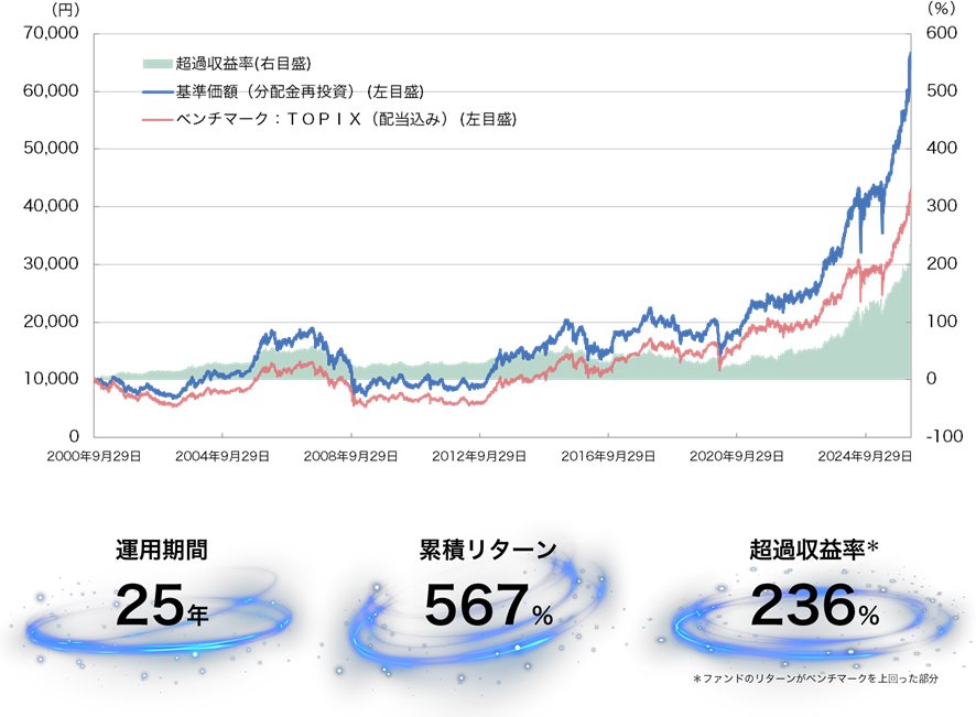 三菱UFJ バリューオープンは、約四半世紀にわたり、ベンチマークであるTOPIXを大きく超過する運用成果を実現してきました。
