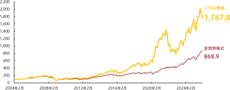上記では、代表的な指数の中で、LTGG戦略の投資対象の性質を表すのに、運用チームが相応と考える全世界株式と比較しています。全世界株式は、MSCI オールカントリー・ワールド インデックス(税引き後配当込み米ドルベース)をもとに委託会社が円換算したものです。上記は指数(円換算ベース、配当込み)を使用しています。全世界株式は参考指数であり、当ファンドのベンチマークではありません。 LTGG 戦略のコンポジットは、運用報酬控除後、円ベース、配当再投資のパフォーマンスを表しています。