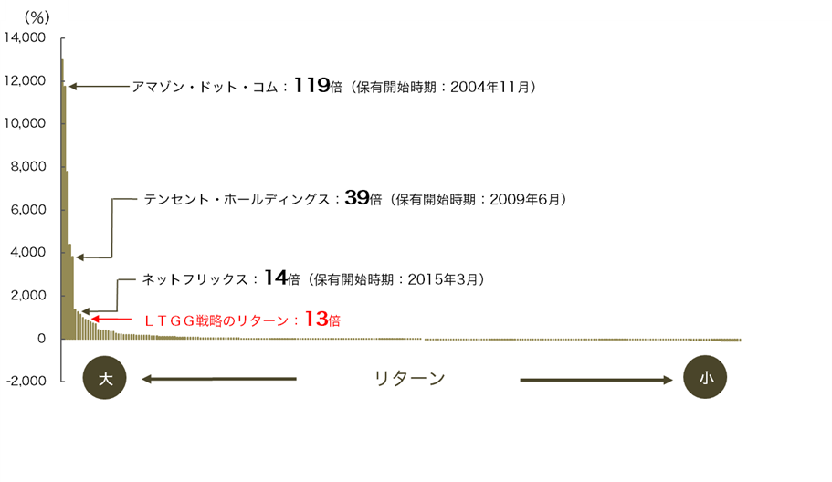 同社は独自のリサーチ手法を駆使し、向こう10年にわたって継続可能な成長力があると予測する企業に投資を行うことで、高いリターンの獲得をめざしています。LTGG戦略における投資銘柄を見ると、一部の銘柄の大幅な上昇が戦略全体の良好なパフォーマンスに大きく寄与していたことがわかります。