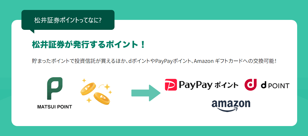松井証券ポイントは、特定の投資信託の購入や1P=1円でdポイントとの交換などができる便利なポイントです。