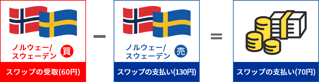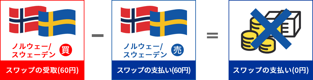 しかし、両建てをすることで売買双方のスプレッドが発生(取引コストを二重に負担)することや、スワップポイントが相殺されることなど経済的合理性を欠くおそれがあります。スワップポイントの例として、例えば、ノルウェー/スウェーデンは買いポジションを保有していれば60円のスワップポイントを受け取ることができますが、売りポジションも保有することで130円のスワップポイントの支払いが発生し、結果的に70円のスワップポイントの支払いが発生します。(2025年8月4日時点)(売り買いともに10万通貨で保有した場合)