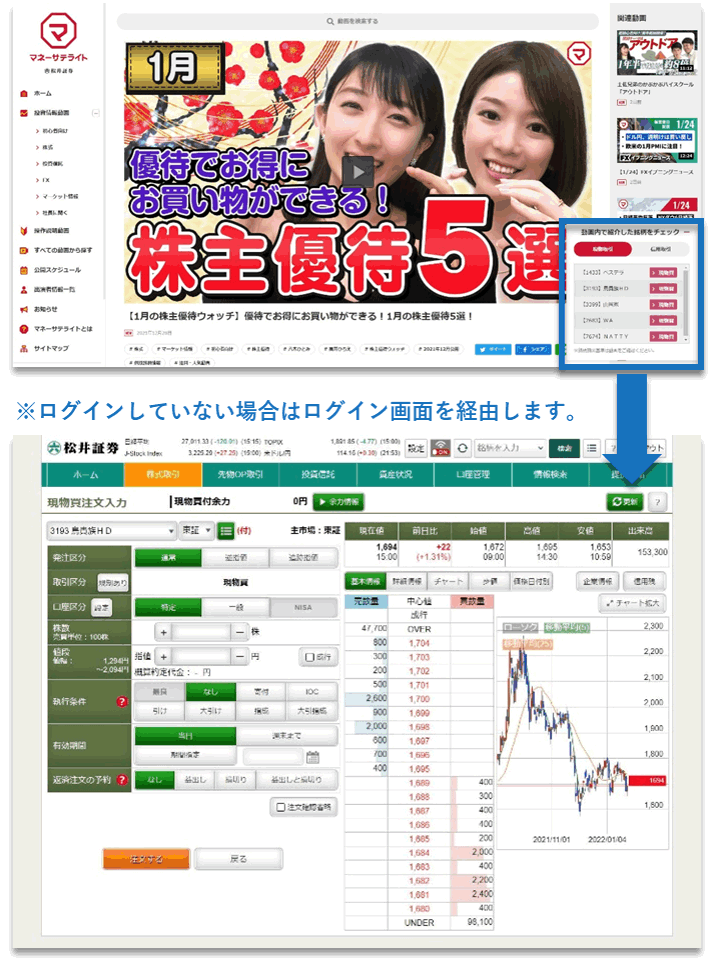 松井証券(以下「当社」)は、動画でわかる投資情報メディア「マネーサテライト」と、取引アプリ・サイトと連携させ、動画内で紹介した銘柄をお客様がスムーズに注文できるよう、機能強化いたしました。