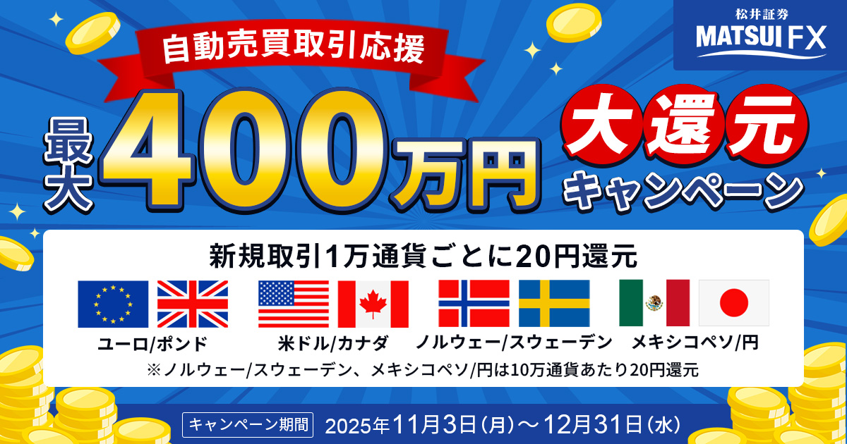 松井証券株式会社(本社:東京都千代田区、代表取締役 社長執行役員:和里田 聰、以下「当社」)は、2025年11月3日(月)より、外国為替証拠金取引(FX)において、自動売買で人気の4通貨ペアを対象とした最大400万円のキャッシュバックキャンペーンを実施いたします。
