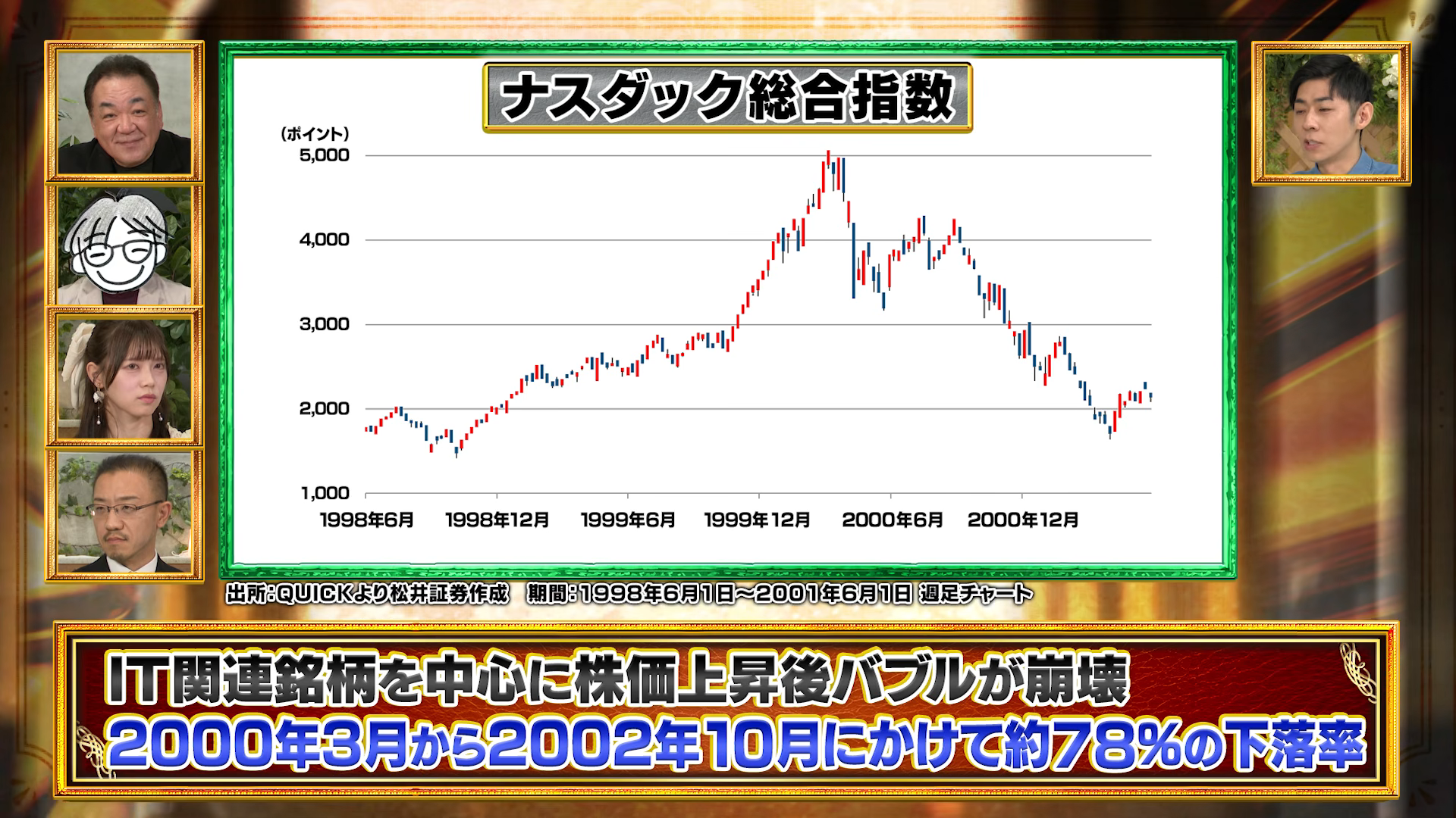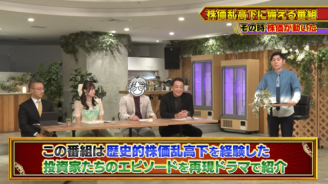 本番組では「ITバブル」、「リーマンショック」、「コロナショック」をテーマに、その渦中にいた投資家の実話に基づき、当事者の心理状態や葛藤を再現ドラマの形式でリアルに描きます。スタジオゲストには、元プロ野球選手の槙原寛己さん、30万円を元手に1億越えの資産を築いた投資家の夕凪さん、アイドルグループ「ラフ×ラフ」の高梨結さんをお迎えします。投資経験も世代も異なる多彩なゲストによるコメントから、未来の投資判断に役立つ、実践的な教訓を学ぶことができます。MCはお笑いトリオ「トンツカタン」の森本晋太郎さんが務め、当社シニアマーケットアナリストの窪田朋一郎が専門家の視点から詳しく解説します。