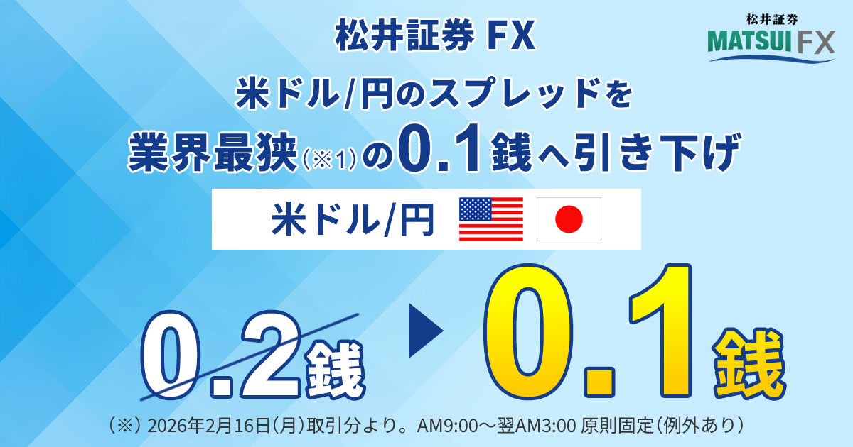 松井証券株式会社(本社:東京都千代田区、代表取締役 社長執行役員:和里田 聰、以下「当社」)は、2026年2月16日(月)取引分より、外国為替証拠金取引(FX)において、米ドル/円の縮小スプレッドを「0.2銭」から業界最狭(※1)の「0.1銭」に引き下げることをお知らせいたします。