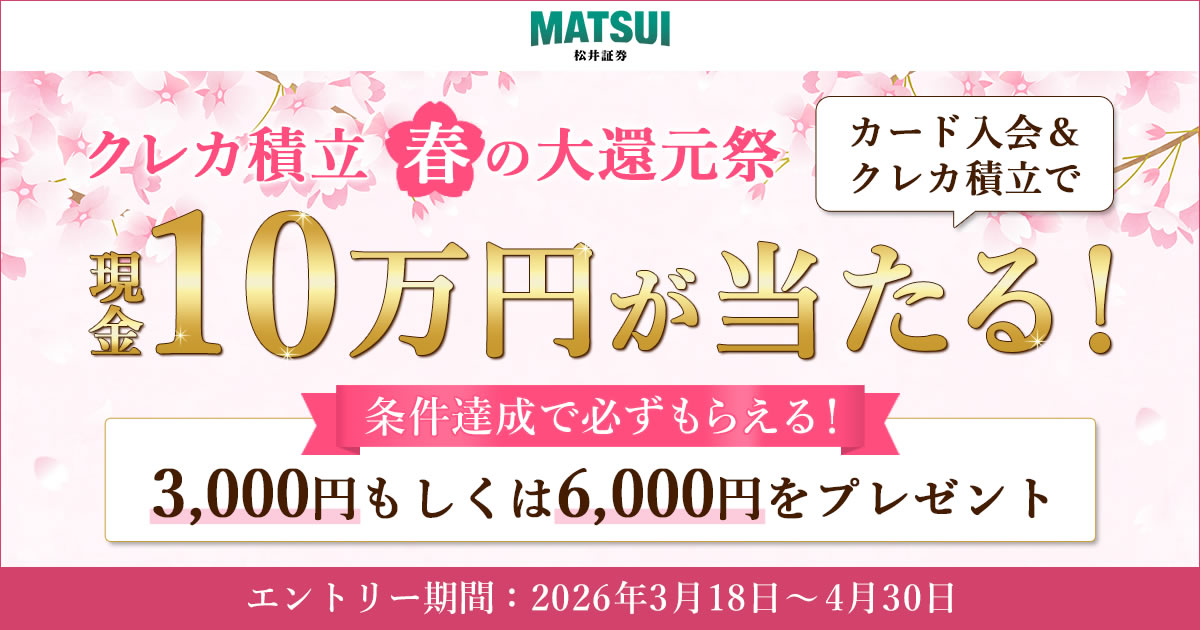 松井証券株式会社(本社:東京都千代田区、代表取締役 社長執行役員:和里田 聰、以下「当社」)は、2026年3月18日(水)より、「クレカ積立 春の大還元祭」キャンペーンを開催いたします。4月から新生活を迎える方々の資産形成を応援するため、参加者全員に最大6,000円をプレゼントするほか、抽選で最大10万円が当たる特典をご用意しております。