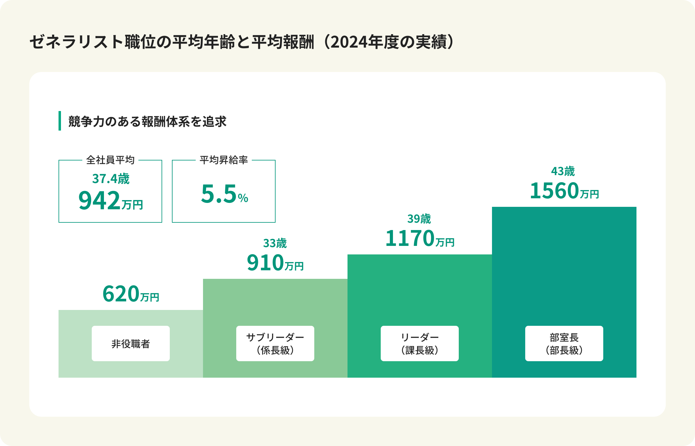 松井証券では、競争力のある評価報酬制度を維持し追求することが、優秀な人材の採用・定着、社員の士気および生産性向上の観点から重要であると考えており、これを評価報酬制度の基本的な方針としています。職位ごとの平均年齢と報酬は以下の通りです。