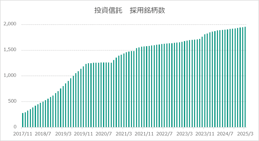 投資信託サービス開始以降、銘柄数の拡充に努め、累計の採用銘柄数は2025年3月末時点で1,950本を超えました。