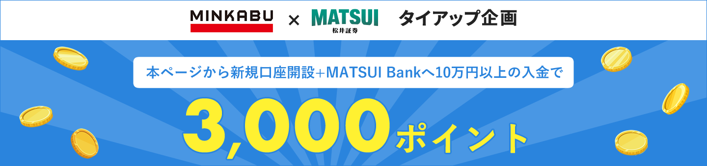 本ページから新規の口座及びMATSUI Bank口座を開設し、MATSUI Bank口座に10万円以上の入金をされたお客様を対象に、3,000ポイントをプレゼントします。