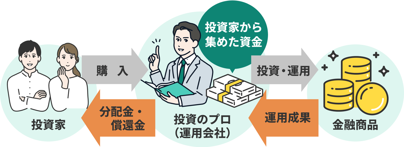 投資信託とは、たくさんの投資家(あなた)から集めたお金を1つにまとめ、プロが運用してくれる金融商品です。