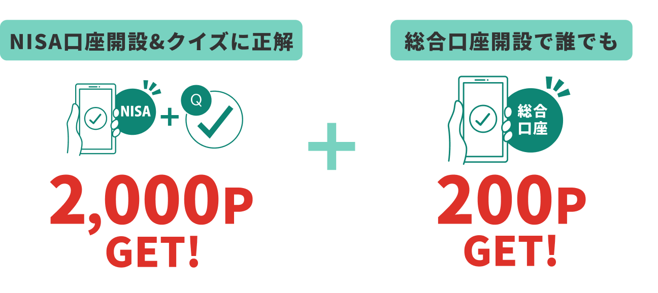 新規で松井証券総合口座及びNISA口座を開設したお客様で、クイズに正解したお客様全員に松井証券ポイントを2,200ポイントプレゼントいたします!