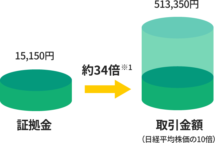 日経225マイクロ先物は、証拠金を差し入れることで、日経平均株価の10倍の取引を行うことができます。