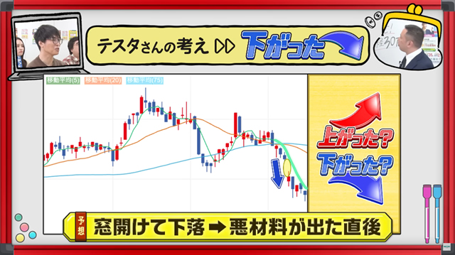 株価が上がったか下がったかを予想する「チャートクイズ」に全員で挑戦します。