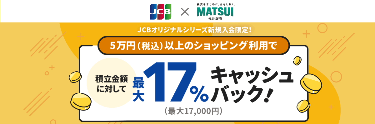 株式会社ジェーシービーが主催する「JCBオリジナルシリーズ新規入会限定 積立金額の最大17%キャッシュバック!」キャンペーンに、松井証券株式会社がタイアップします!奮ってご参加ください!条件達成でもれなく積立金額の最大17%(17,000円)のキャッシュバックを受けられます!