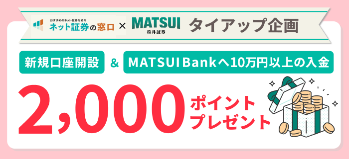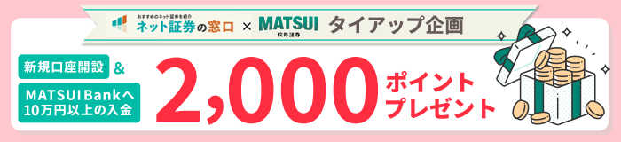 本ページから新規に松井証券の口座及びMATSUI Bank口座を開設 し、MATSUI Bank口座に10万円以上の入金をされたお客様を対象に2,000ポイントをプレゼントします。