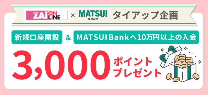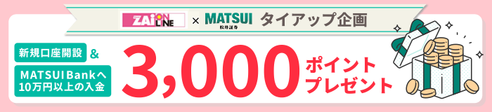 本ページから新規に松井証券の口座及びMATSUI Bank口座を開設 し、MATSUI Bank口座に10万円以上の入金をされたお客様を対象に3,000ポイントをプレゼントします。
