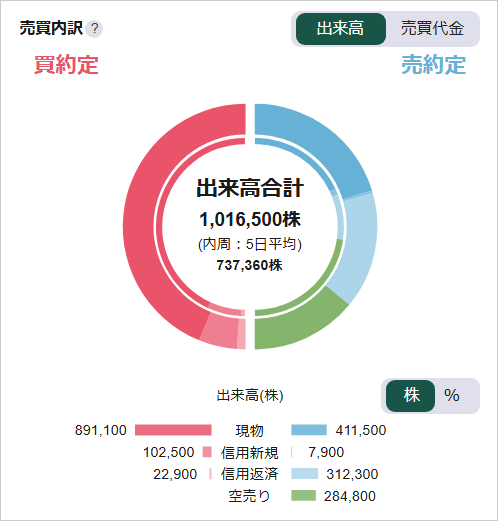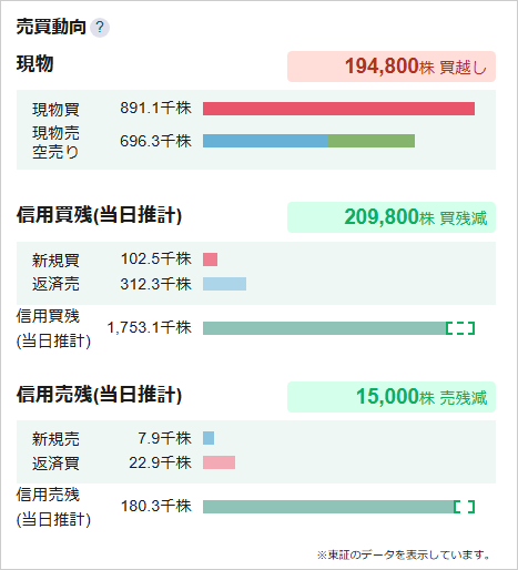 個別銘柄の出来高・売買代金の当日の売買の内訳について、「現物/信用新規/信用返済/空売り(機関投資家)」の区分で確認できます。