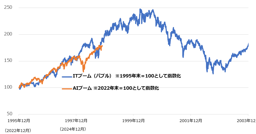 現在のAIブームについては、1990年代後半のITバブル(ITブーム)と重ねて論じる向きが多い。それぞれの出発点となるエポックメイキングな事象といえば、ITブームは1995年8月の「Windows95」の発売(日本での発売は11月)、AIブームは2022年11月の「ChatGPT」の一般公開だ。1995年末と2022年末を起点として、S&P500の値動きを重ねてみたのが以下のグラフだ。
