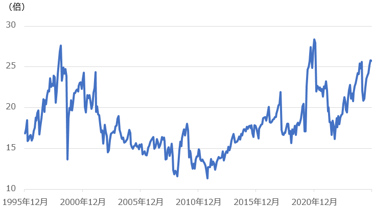 (出所)ブルームバーグのデータを元に松井証券作成。予想PERは12カ月先予想PER。期間:1995年12月末~2025年11月末 月次