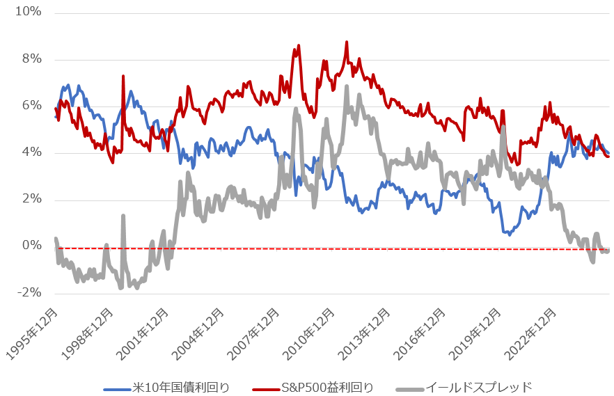 (出所)ブルームバーグのデータを元に松井証券作成。「S&P500益利回り」は上のグラフの予想PERの逆数。期間:1995年12月末~2025年11月末 月次