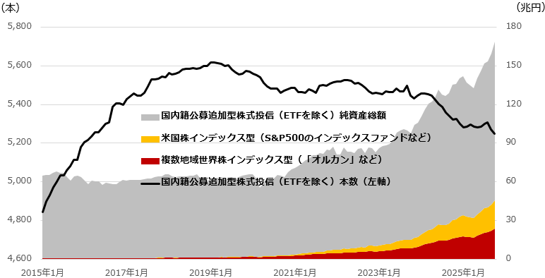 (出所)QUICKおよび投資信託協会のデータを元に松井証券作成。期間:2015年1月~2025年10月 月次