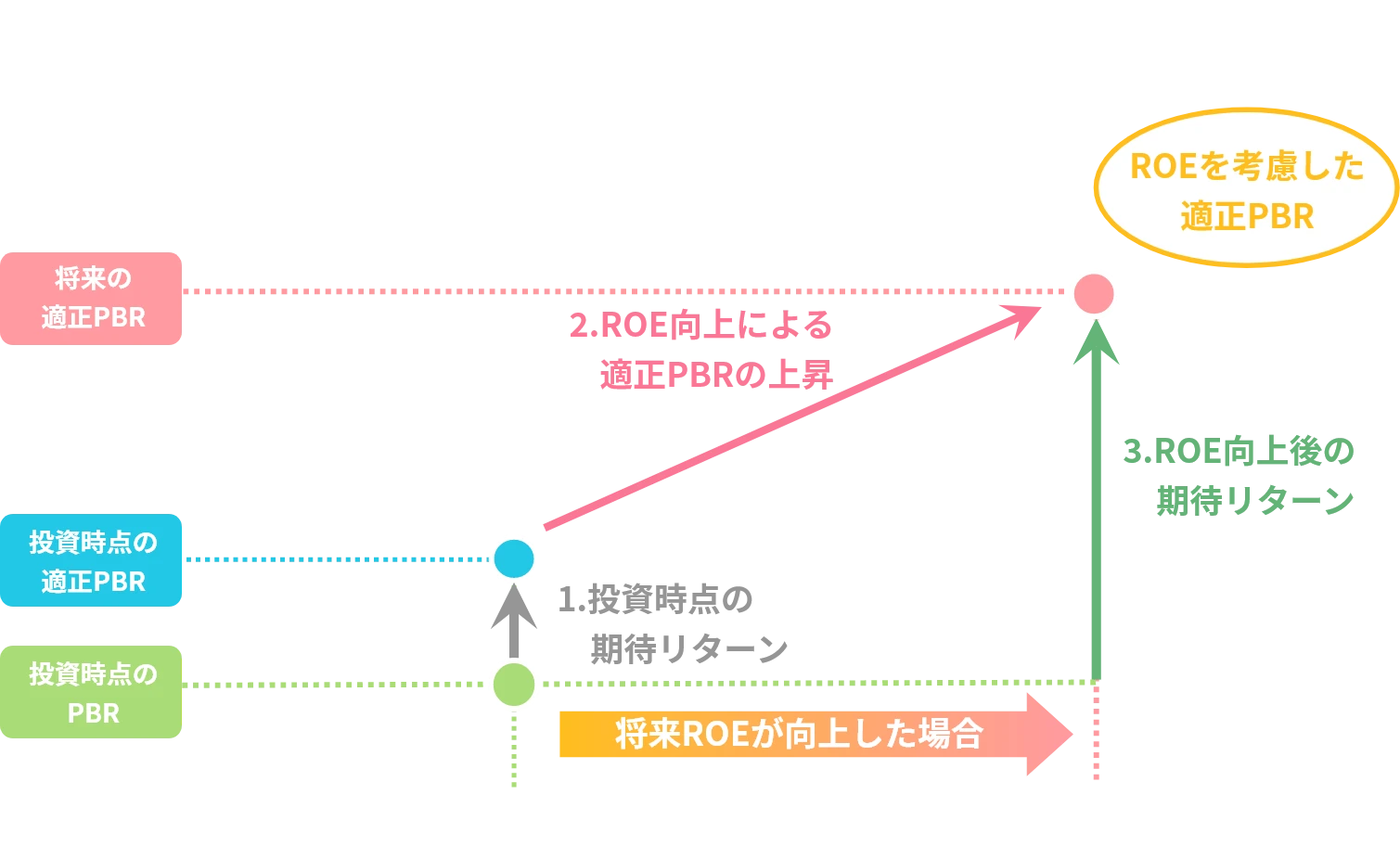 - ROEが向上する場合、ROEの上昇により適正PBRが上昇する(下図2)ため、期待リターンが⾼まります(下図3)。