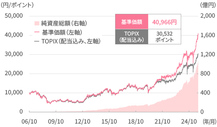 - TOPIX(東証株価指数、配当込み)をベンチマークとし、中長期的にベンチマークを上回る投資成果を目指します。
