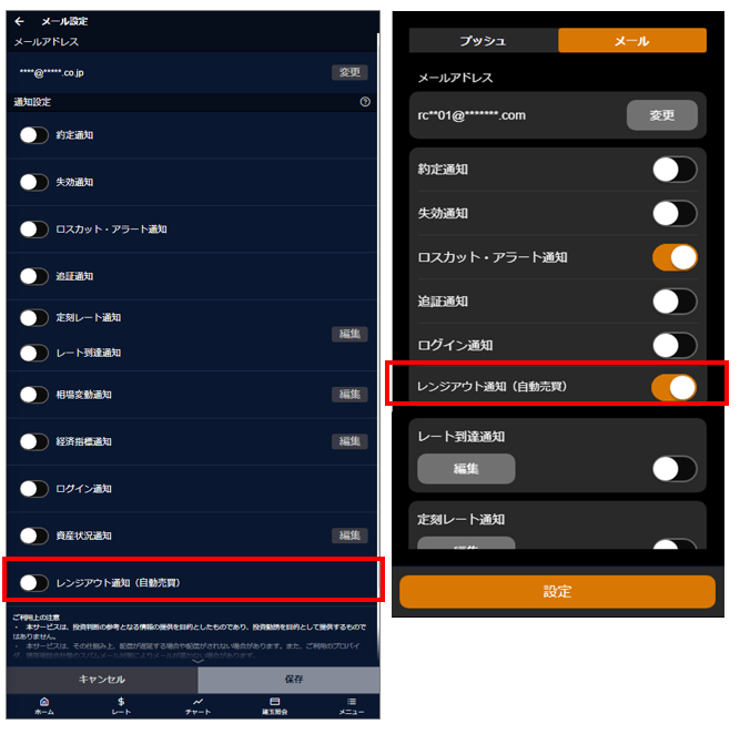 【FXお客様サイト】-【設定】-【メール設定】にレンジアウト通知(自動売買)追加されます。