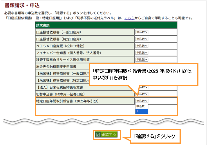 - 「特定口座年間取引報告書(2025年取引分)」の請求フォームのご利用は2026年3月下旬頃までとなります。以降は電話かWEBのお問い合わせでのみ郵送を承ります。