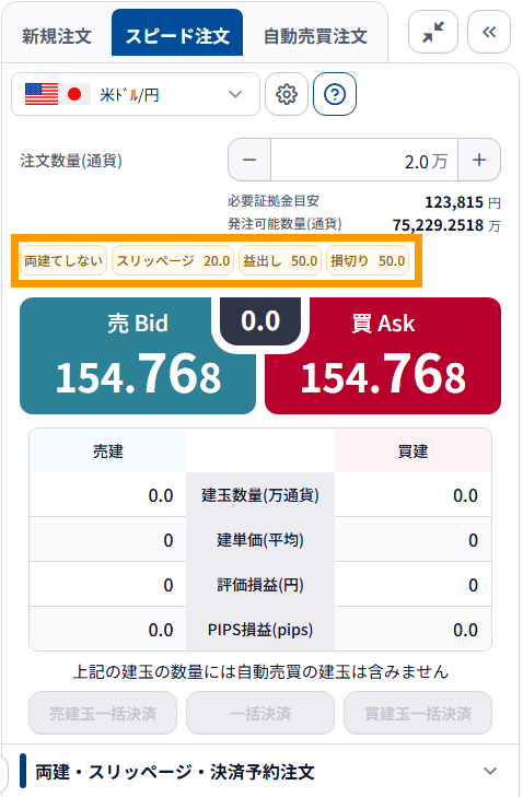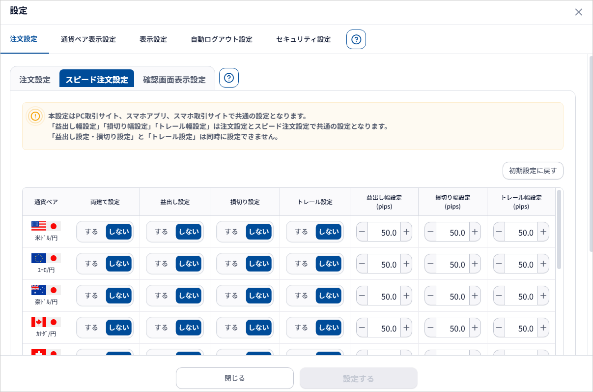 - 2025年7月26日(土)の大幅リニューアル以降、FXアプリ・FXスマホサイトのスピード注文設定画面で設定を保存していた場合、その設定内容がPC向けFXお客様サイトにも自動反映されます。