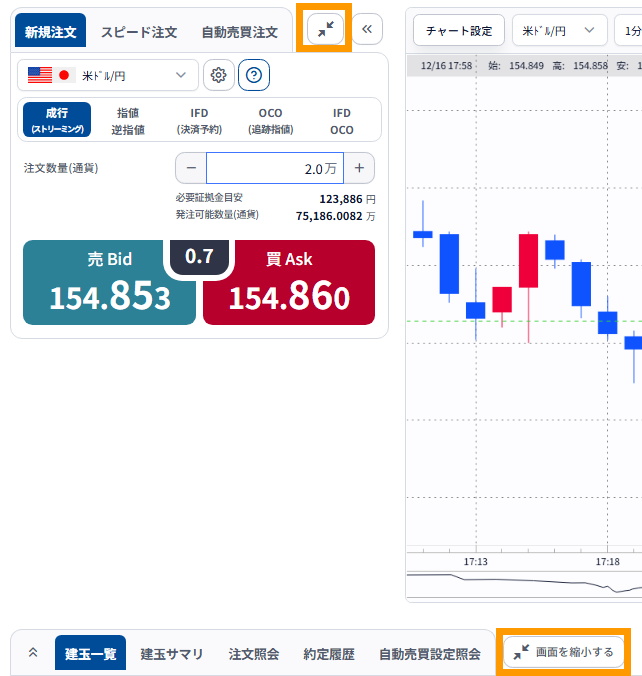 縮小することで新規注文と建玉一覧等を画面スクロールせずに一画面で確認できるようになります。