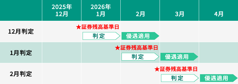 | ランク判定と優遇金利の適用タイミング | 毎月の最終営業日時点の対象証券残高の合計(上記参照)を基準に、翌々月のランクを決定。ランクに応じた円普通預金金利は、毎月1日より適用