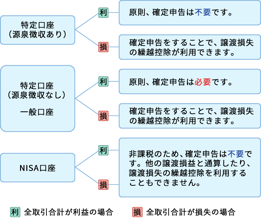 1年間(受渡日ベースで1/1~12/31)の取引状況によって、確定申告が必要な場合があります。お客様ご自身がどのケースにあてはまるか、次の図を参考にしてください。