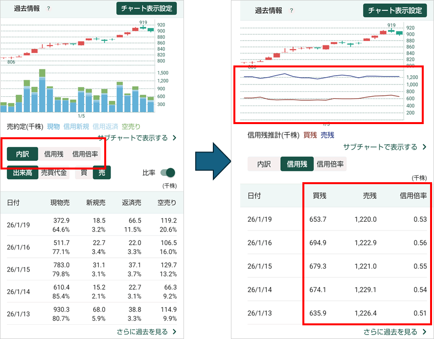 現在は、日本株アプリのサブチャートで信用残のみ参照できますが、今回の対応でアプリとWEBの両方で信用残、信用倍率の推移を確認できるようになります。