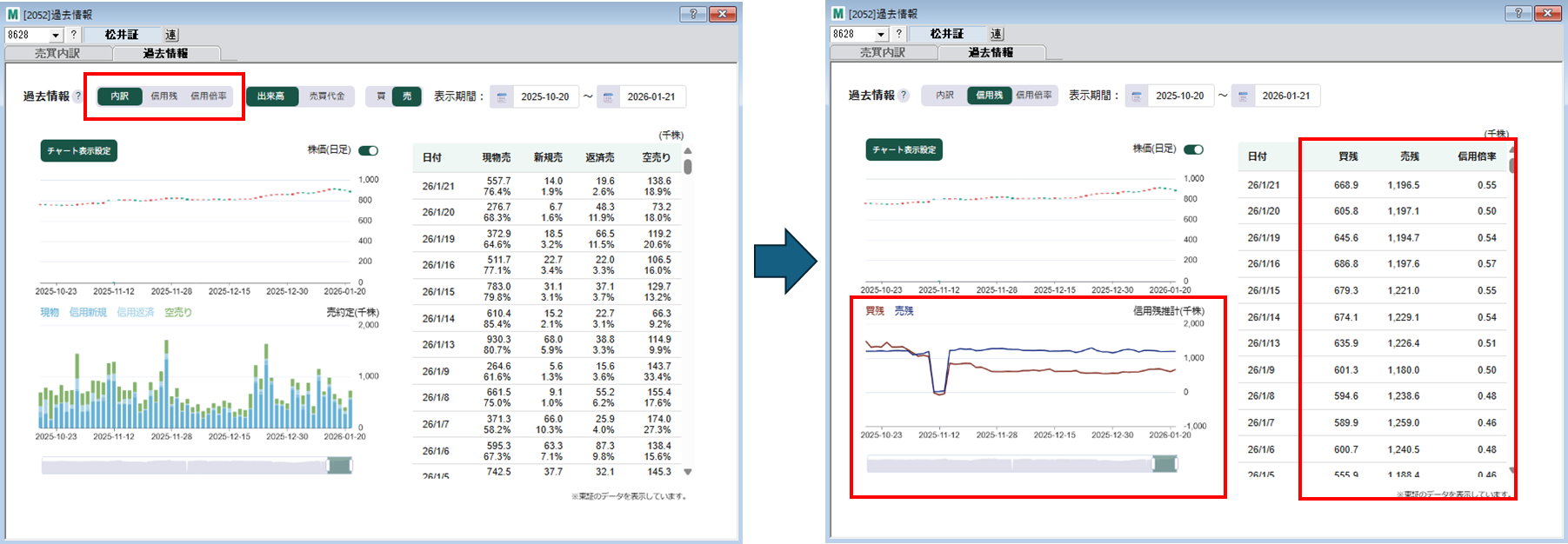 お客様からのご要望をもとに、売買分析画面の「過去情報」で「信用残(当日推計)」と「信用倍率(当日推計)」の推移を確認できるようにします。