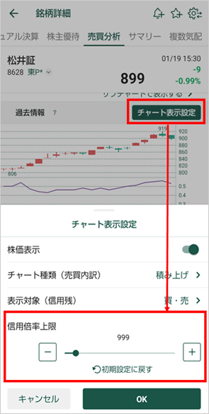 売買分析画面のチャート表示における信用倍率上限を変更できます