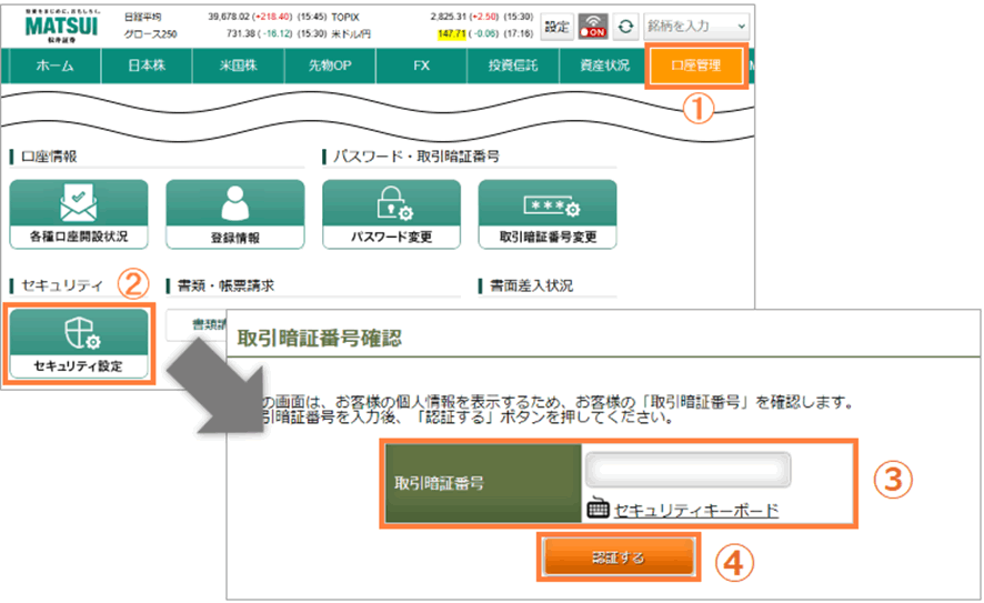 2.【口座管理】-【セキュリティ設定】を選択し、取引暗証番号を入力して「認証する」を押します。