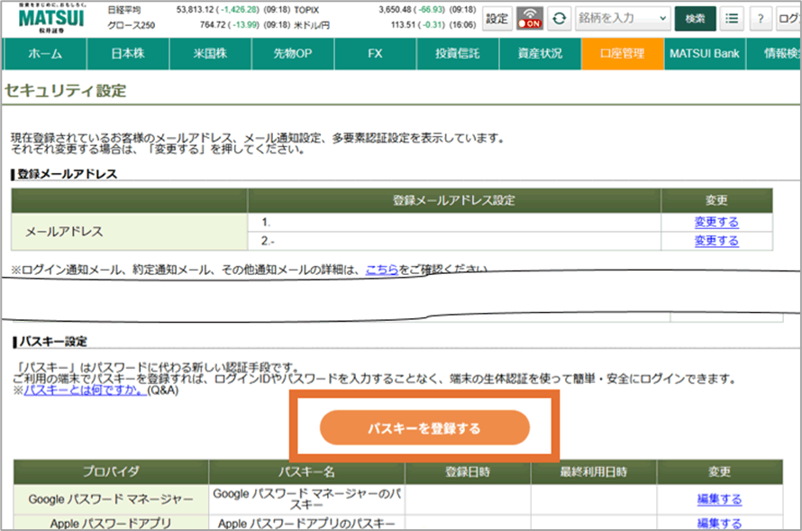 3.画面下部にある「パスキー設定」欄で「パスキーを登録する」ボタンを押します。