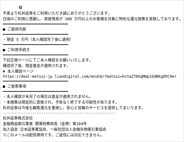 - メールのみでキャンペーンのご連絡をすることはありません。キャンペーン・プログラム一覧、各お客様サイト のお知らせに掲載されているかを必ずご確認ください。(例:現金5万円進呈・ログインキャンペーン等)