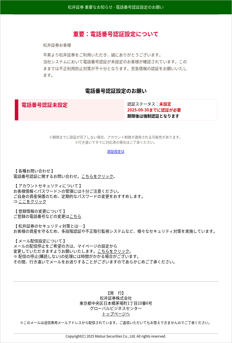 「@」より後ろの「matsui.co.jp」が、「matui」となっていて’s’が抜けている場合は、松井証券からのメールではありません。