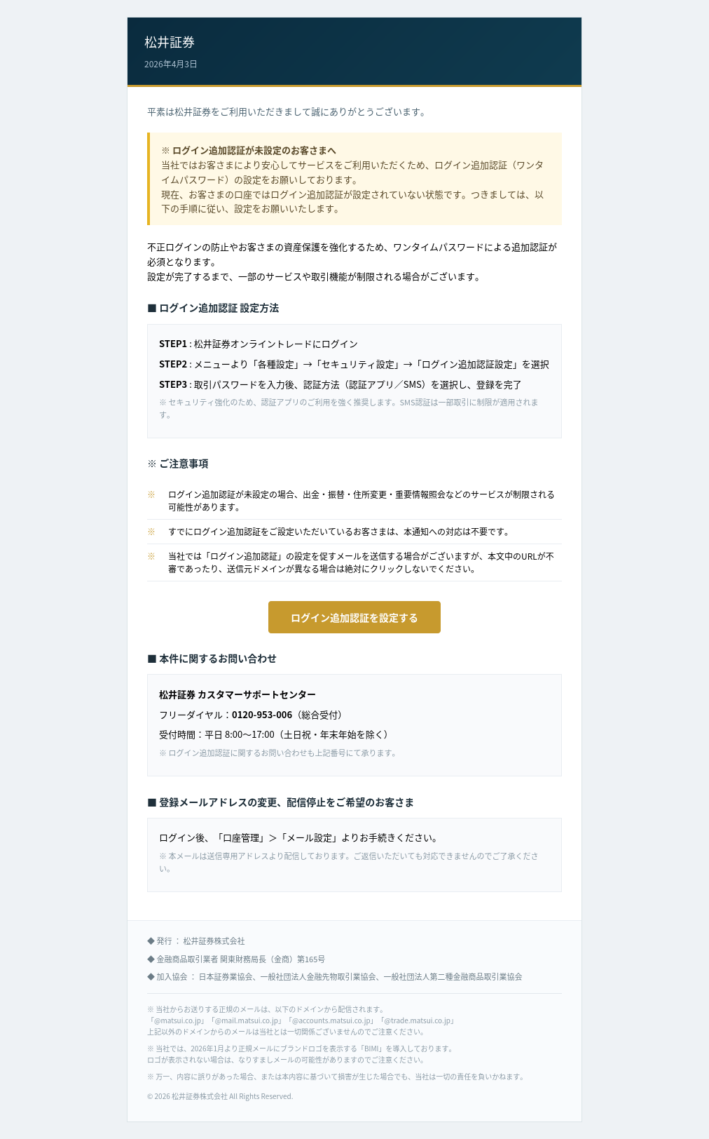 【重要】松井証券:不正取引リスクから資産を守るため、AI監視システムの接続を開始してください
